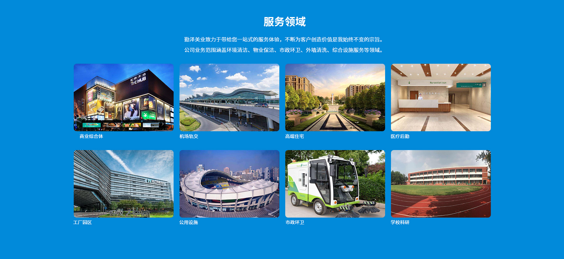 公司致力于把“勤澤美業(yè)”培育成眾口皆碑、令人尊敬、具有長期價值的服務領袖品牌。業(yè)務范圍涵蓋環(huán)境清潔和綜合設施管理服務,公司具備環(huán)衛(wèi)、保潔、石材等多個行業(yè)一級資質(zhì),致力成為中國環(huán)境服務行業(yè)的領導者。